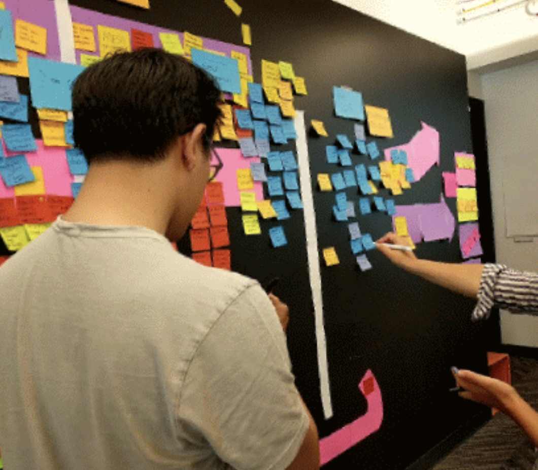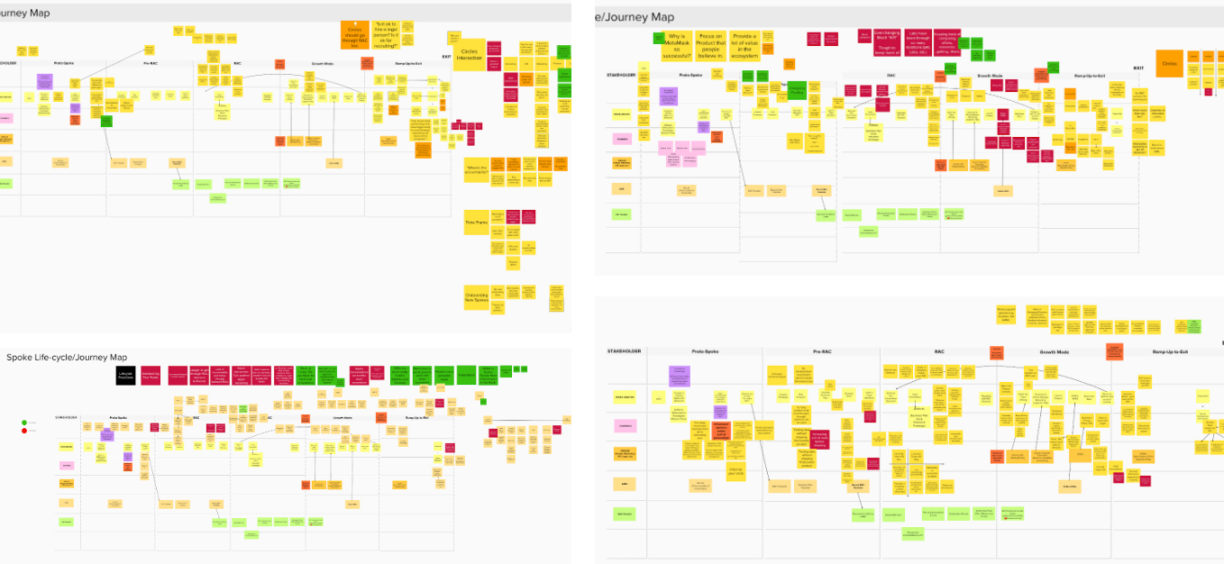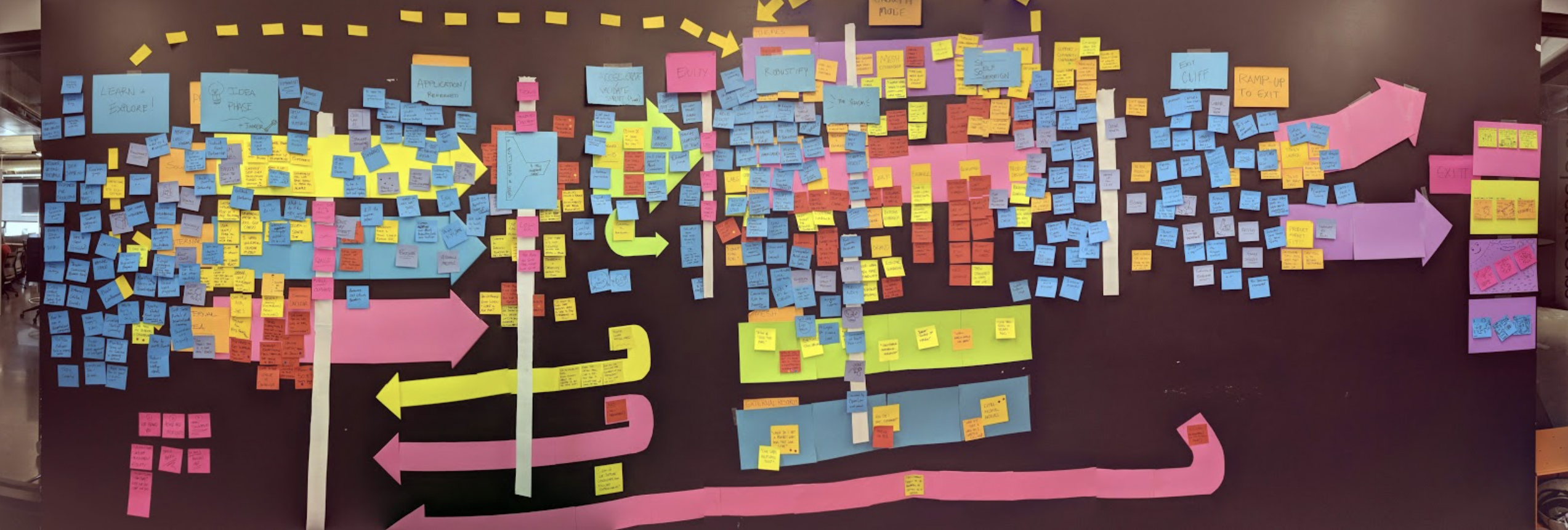 We learned a ton - navigating the resources of our org was hard. Being an entrepreneur is exciting! Exhausting! Difficult! We then condensed everything we heard into a single journey - complete with pain points, opportunities, and bright spots. Then we brainstormed (using blue stickies) on top of the journey.