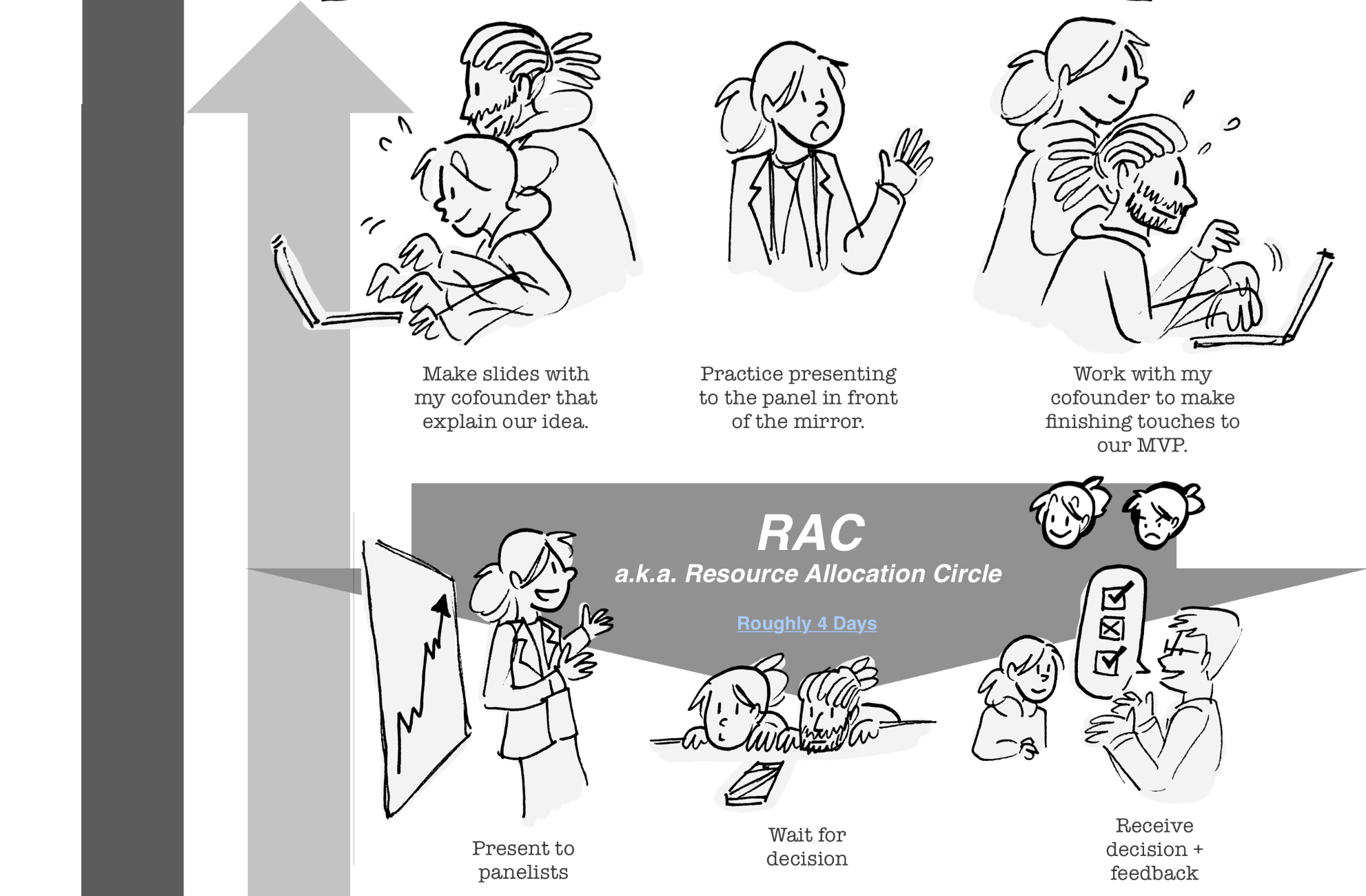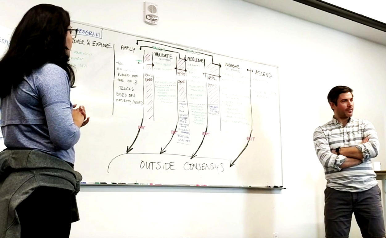We then refined the blue stickies into a blue-sky model of what an ideal accellerator program would look like. The intention that this new model would make lives easier for the founders - making resources and pathways easier to find - and giving a everyone (founders, leadership, and service providers alike) in our org a clear idea of how a path from seed to exit could look. We brought in real founders to our workshop space for feedback on the product so we could continue to iterate. Yep - our prototype was a drawing on a whiteboard.