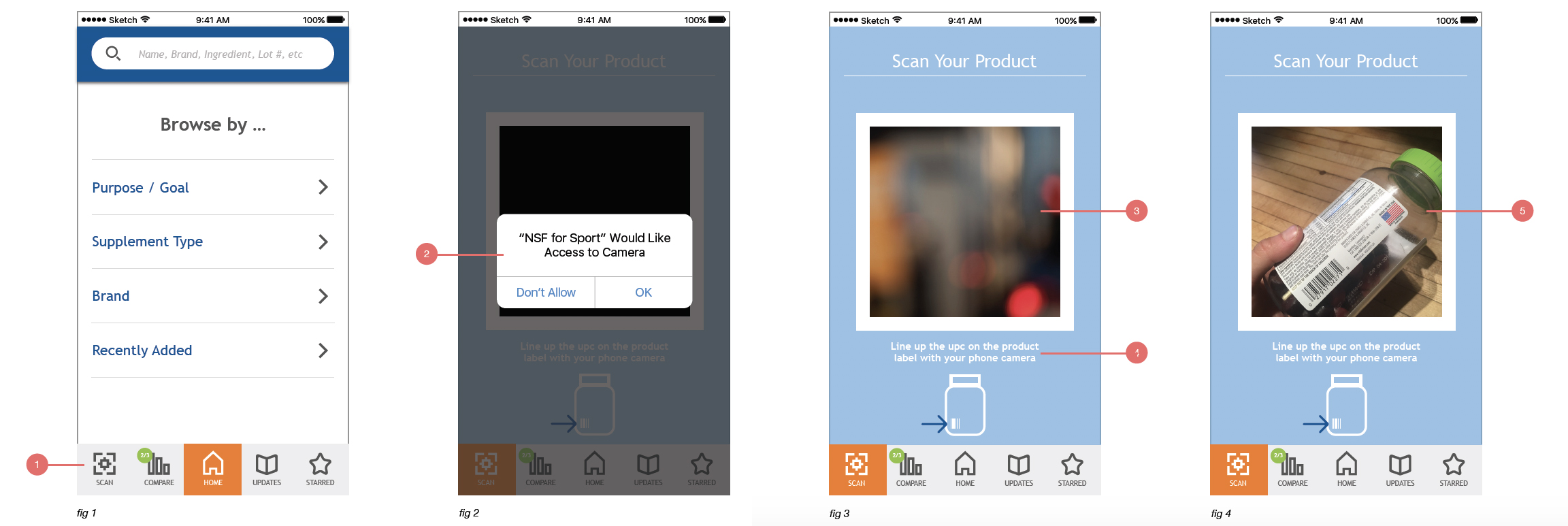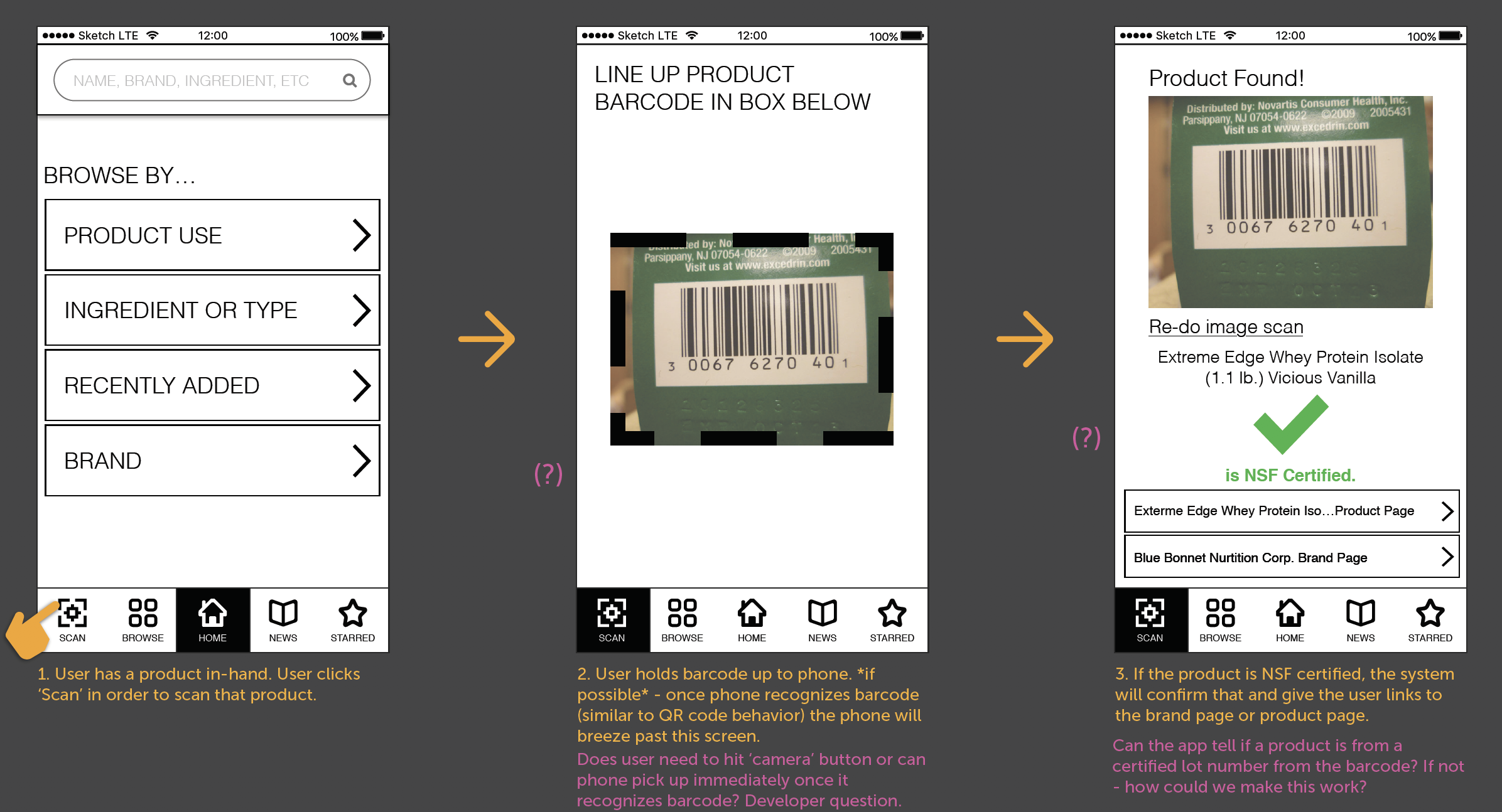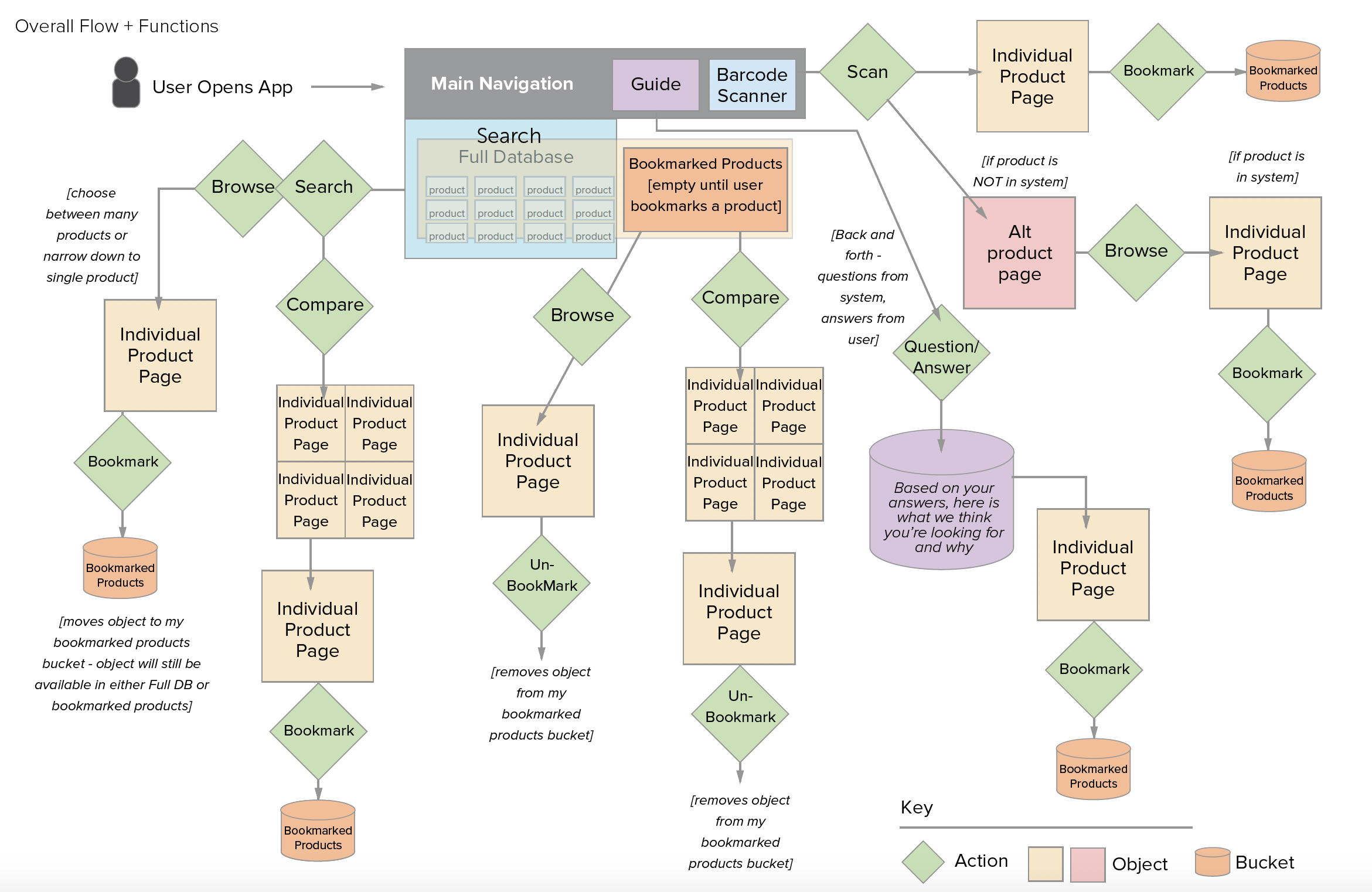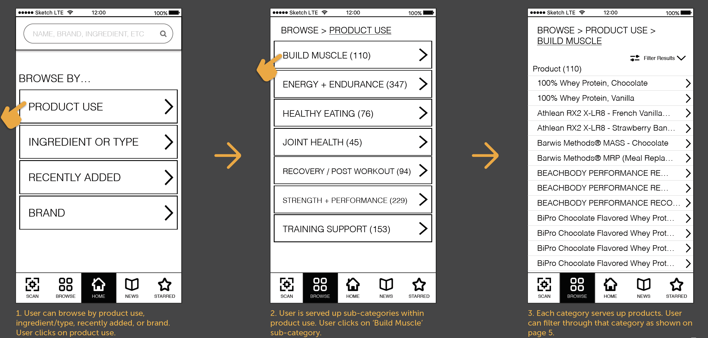 Our Approach: We started by understanding the variety of different users and their needs as well as how the current NSF for Sport application was being used (or not). The app is used by a range of people - everyone from elite Olympic-level athletes that have to take drug tests for their sport to gym buffs picking out a new protein powder to a coach working with high-schoolers. There were a myriad of use cases that the new app could address as well as heuristic problems with the existing UI. These use cases led us to create a few different conceptual models of how the thousands of products in the database could potentially be navigated through.