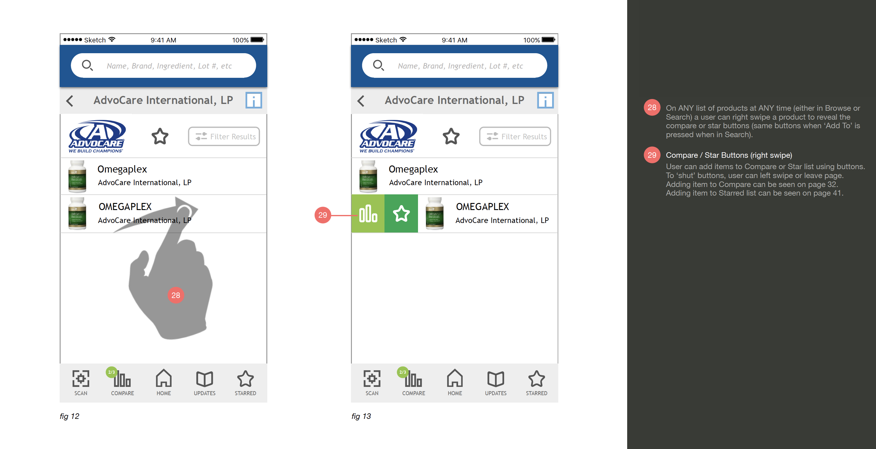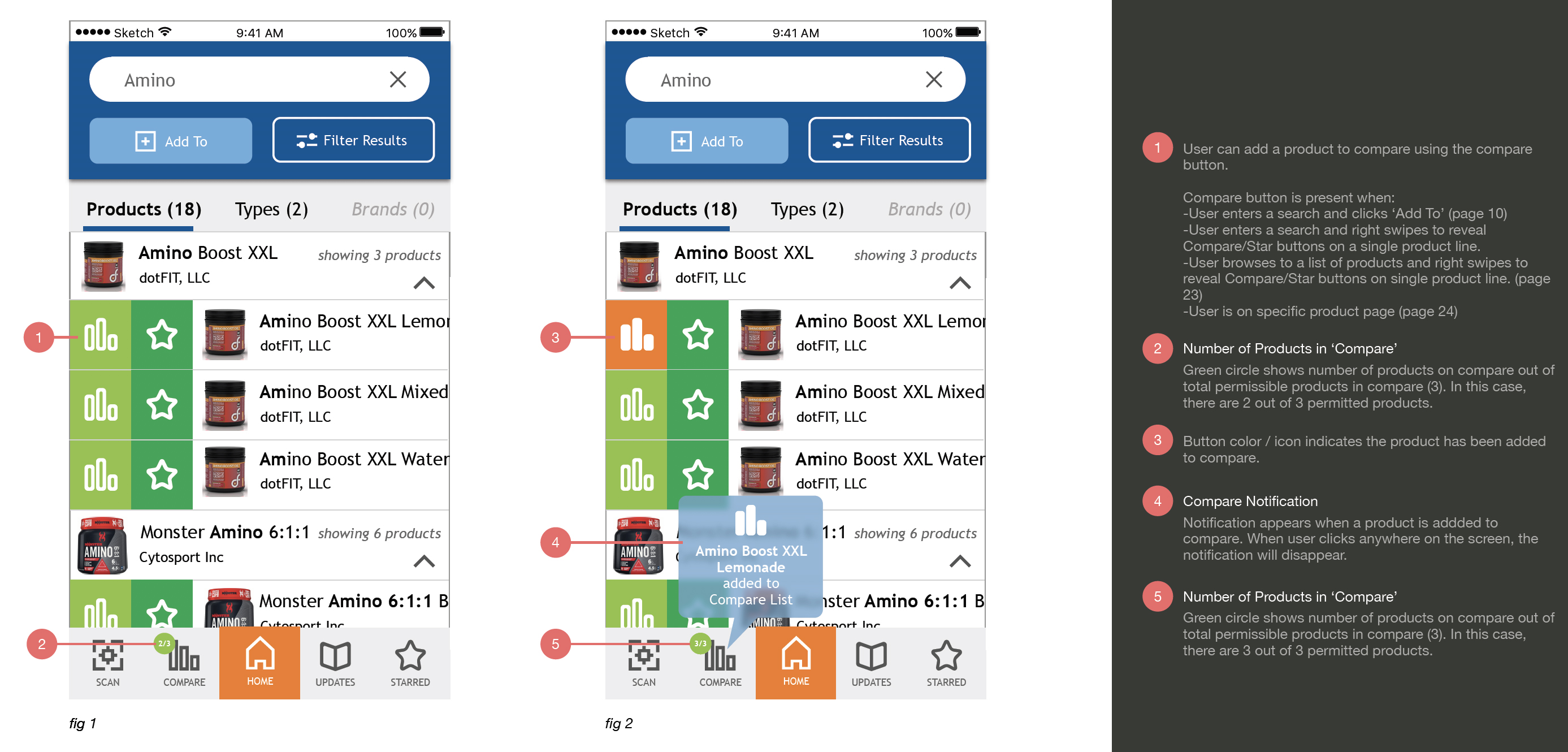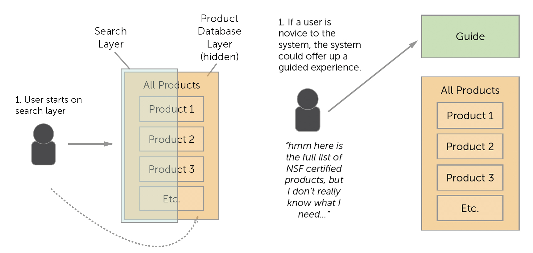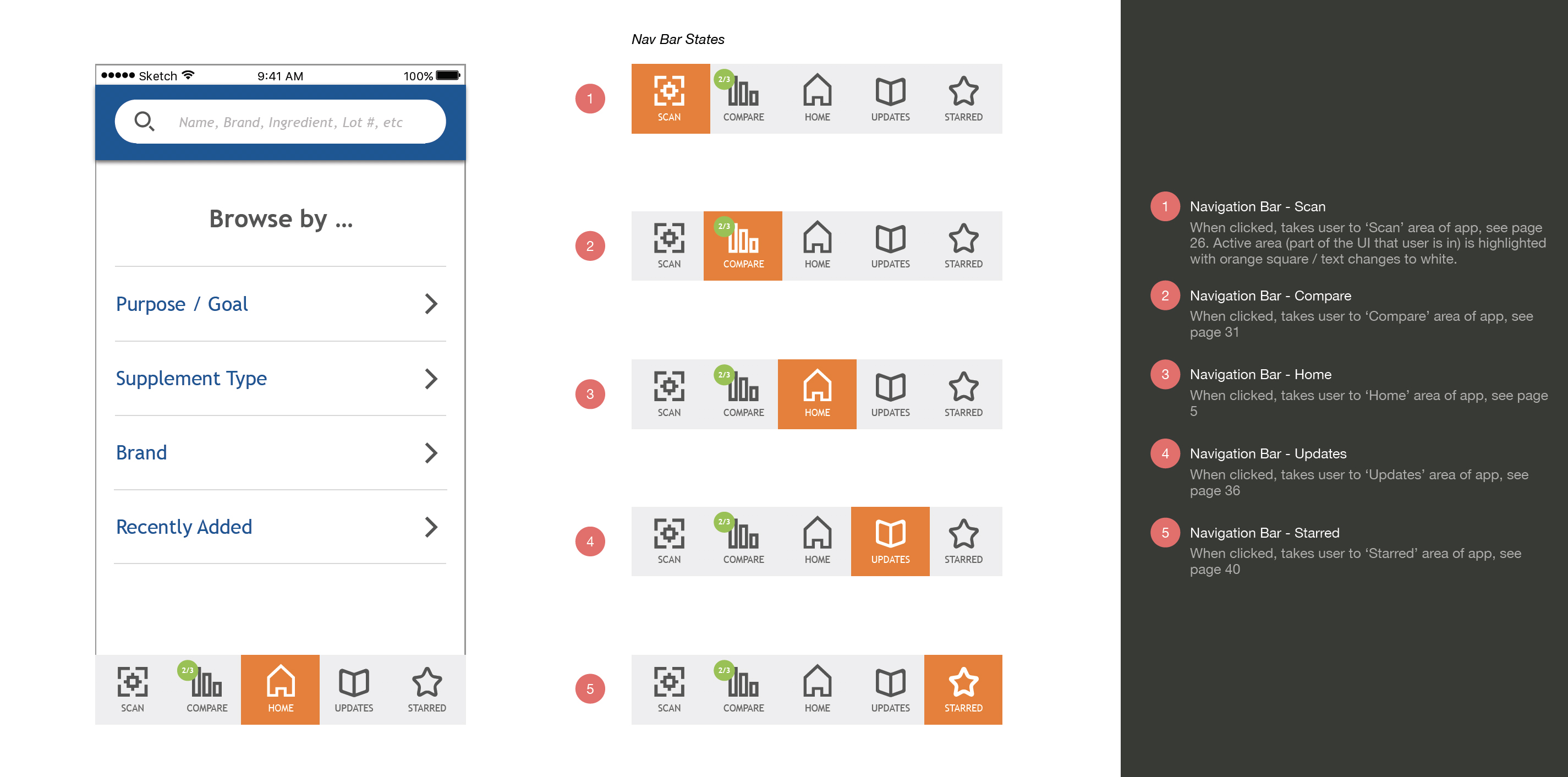 Our Approach: We started by understanding the variety of different users and their needs as well as how the current NSF for Sport application was being used (or not). The app is used by a range of people - everyone from elite Olympic-level athletes that have to take drug tests for their sport to gym buffs picking out a new protein powder to a coach working with high-schoolers. There were a myriad of use cases that the new app could address as well as heuristic problems with the existing UI. These use cases led us to create a few different conceptual models of how the thousands of products in the database could potentially be navigated through.